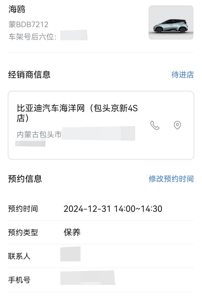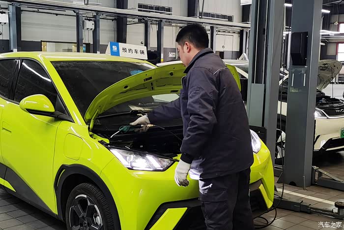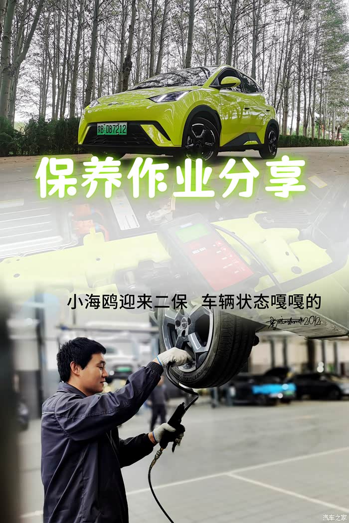 【保养项目和步骤】在快要到一年的保养周期,小海鸥的车机系统在每次通电启动后,都会弹出保养提示栏,需要在手机APP上进行预约。海鸥这车销量大,预约车辆也特别多,我终于约到了2024年的年底最后一天进店保养。首保是免费的,二保需要携带行驶本,保养手册和4S店赠送的免费保养卷。新能源纯电车在基础保养方面与燃油版车型迥异,没有机油、机滤、空滤这些项目,主要就是车辆的各种检测。其中包括:车辆健诊服务、售后服务6件套、WEQEA9011002BYD常规保养、15分钟轻洗服务,以及提供了保养后的免费洗车服务。