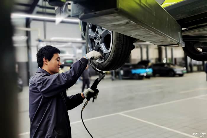 在保养项目中,还提供了底盘和轮胎的检查。底盘螺丝是否有松动,减震器是否有漏油等情况,另外还检查了轮胎磨损情况以及是否有被扎。冬季轮胎的胎压会因为气温的降低而下降,海鸥只有胎压报警的功能,不具备四轮胎压检测,维修小师傅将胎压不足的轮胎都给补足了气压。