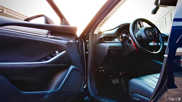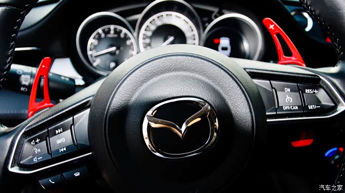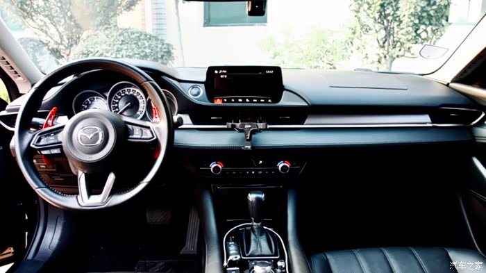 坐进车内,大量真皮包裹的内饰隐隐透露着一丝奢华,打孔真皮座椅的柔软度很舒适,中控台都是软性皮质包裹,缝线细密均匀,显得非常精致。握感舒适的方向盘比较粗壮,左右两侧各有一个鲜红色的换挡拨片,吸睛夺目,充满运动气息;性能车上经常使用的炮筒式仪表也出现在这里,复古味运动感都全了,视觉上整车内饰还是非常有质感的,第一次坐进阿特兹的车内,感觉很不错。