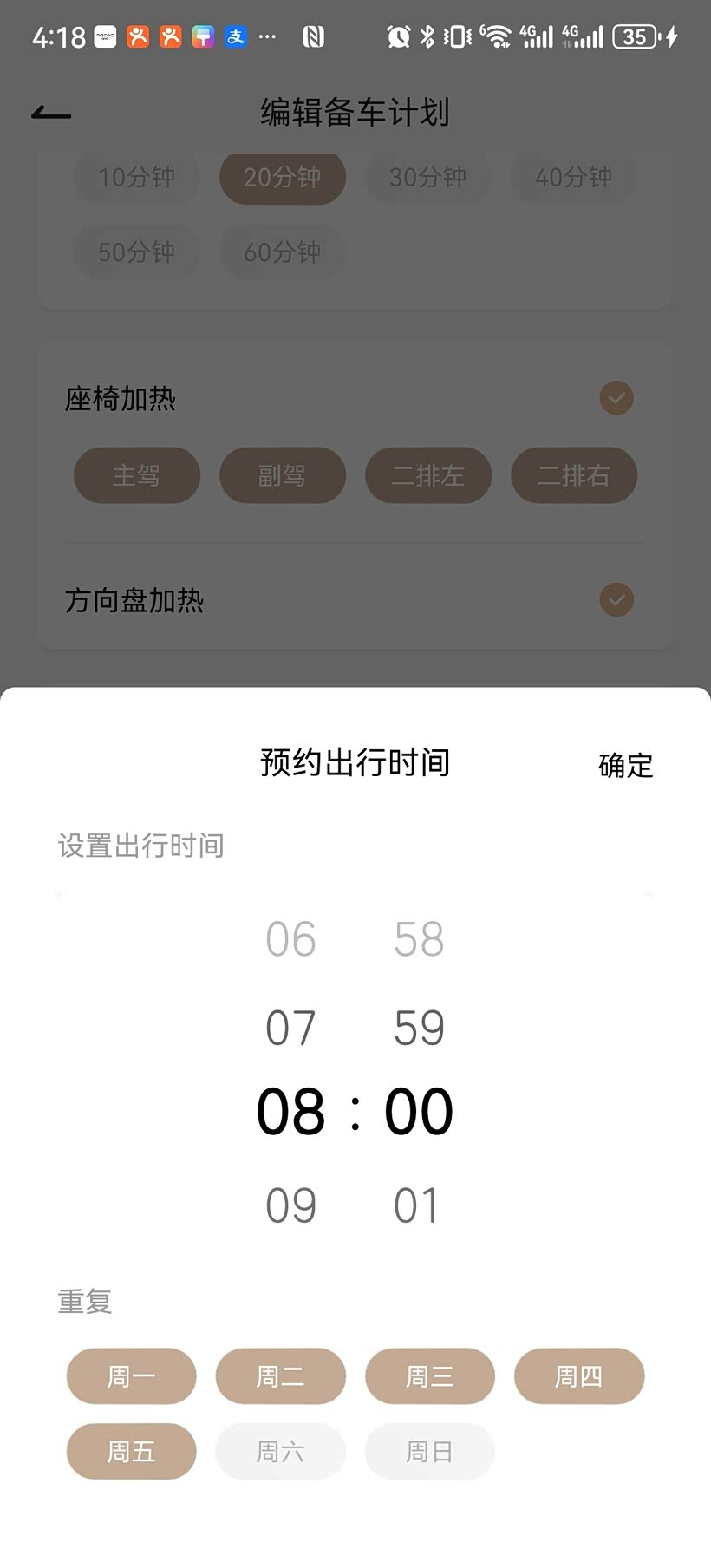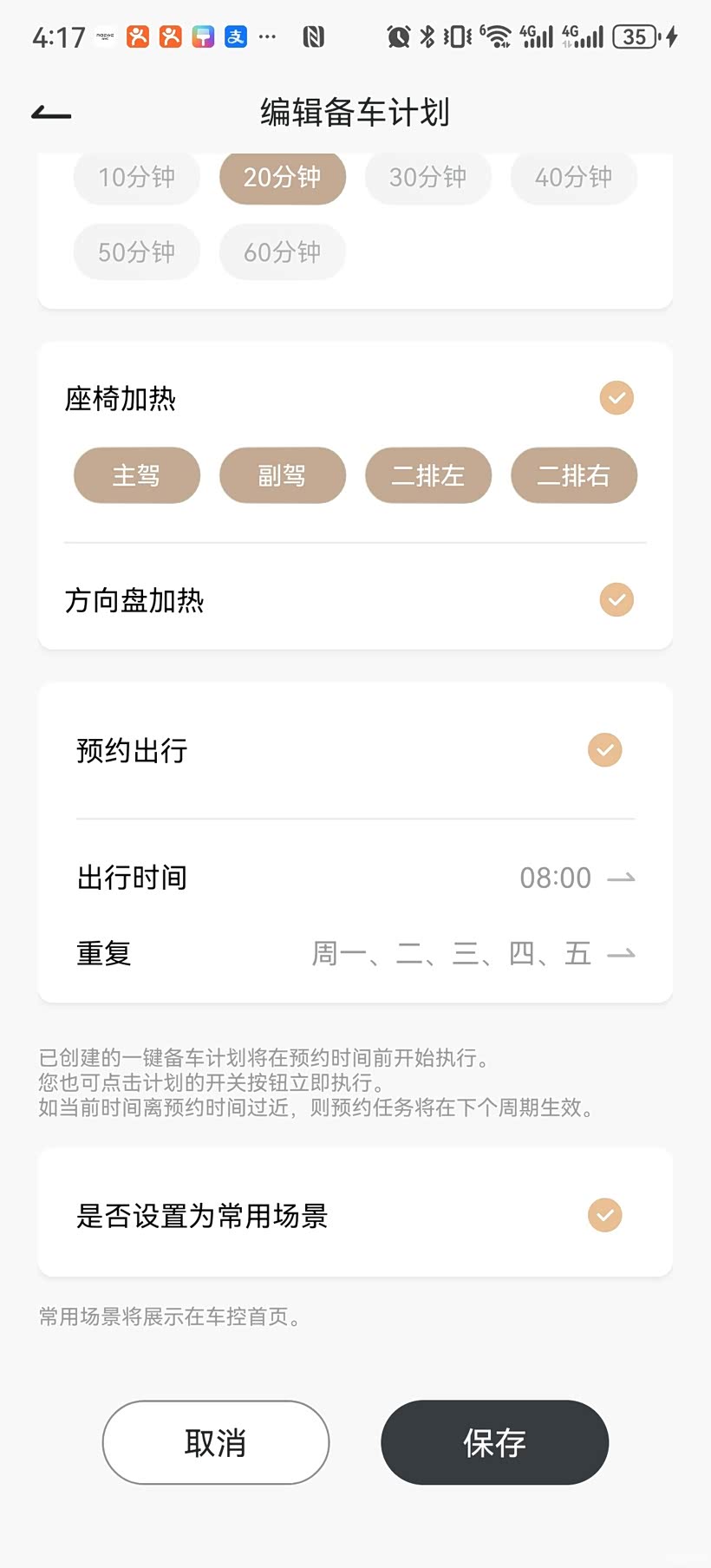 先划重点讲核心的手机 APP 一键备车功能,操作简单还特别省心,用过一次就再也离不开。首先打开上汽荣威 APP,在 “智能服务” 板块找到 “一键备车” 入口,点击 “新建备车计划” 就能自定义设置了。可以给计划起个好记的名字,比如 “工作日通勤备车”,然后按需勾选空调、座椅加热、方向盘加热,温度建议设为 25-28℃,运行时间选 10-20 分钟就足够。最实用的是预约出行功能,像我这种朝九晚五的上班族,直接设置周一到周五早上 8:00自动备车,车辆会提前 5-10 分钟启动相关功能,完全不用手动操作。