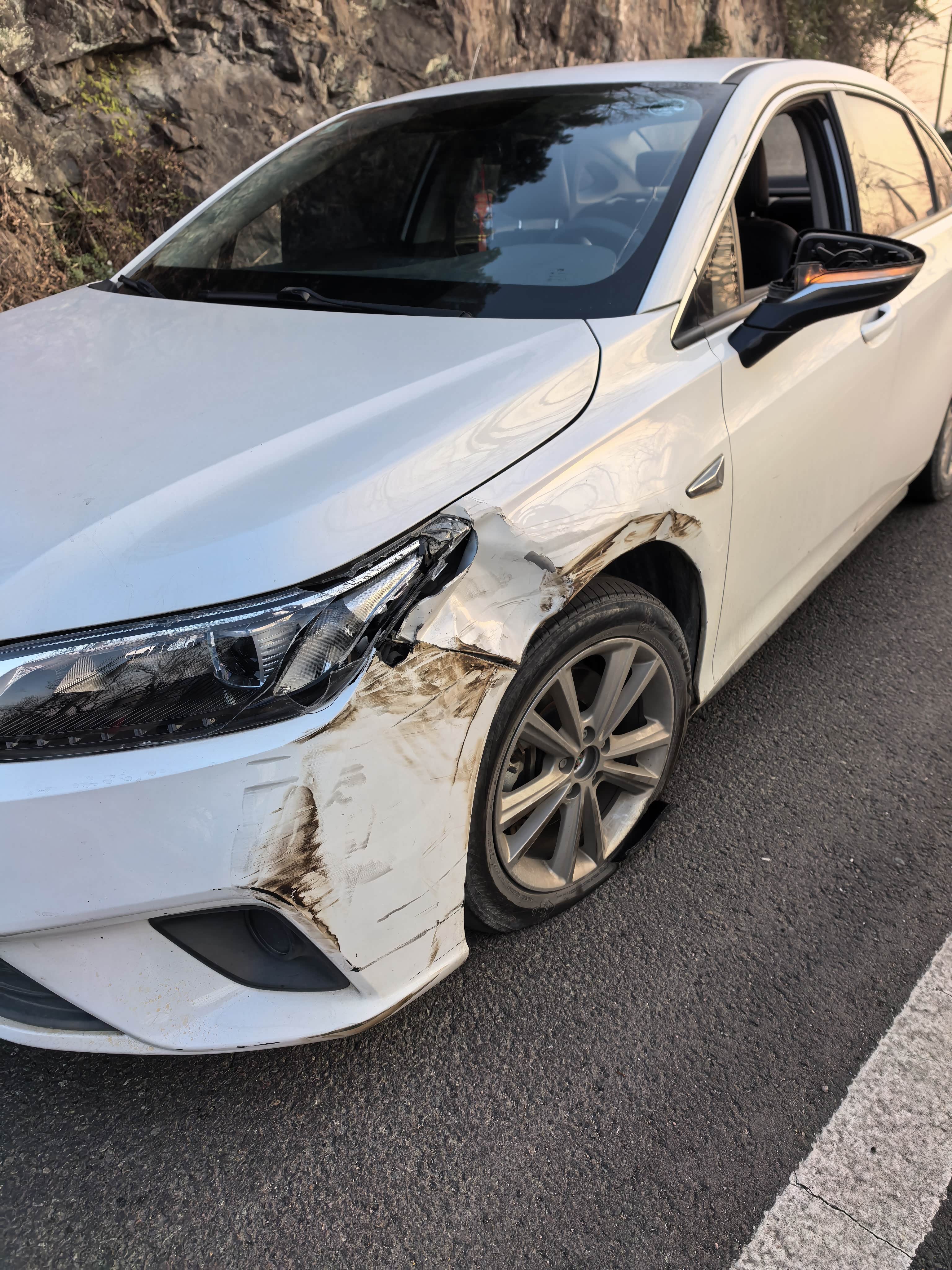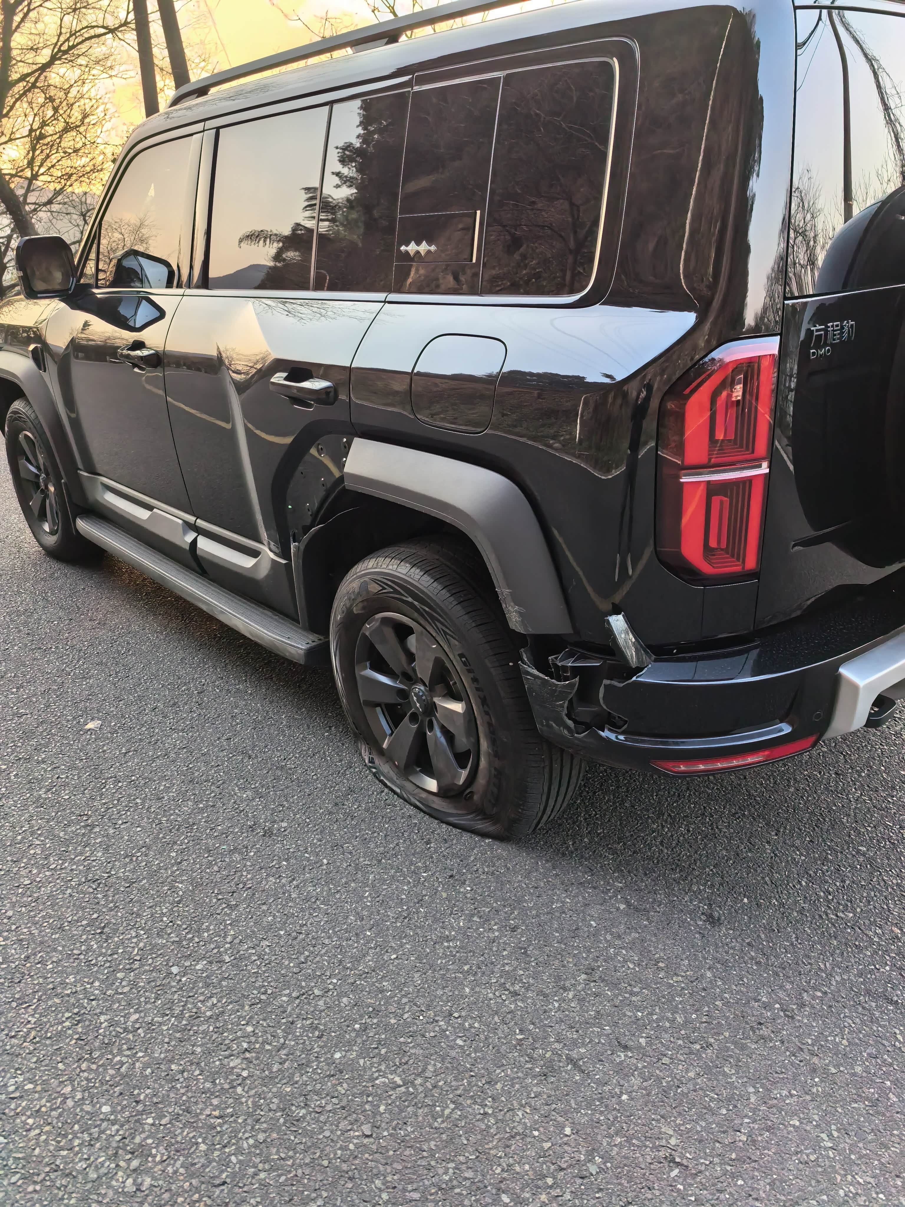 和一辆轿车发生斜对侧相撞,对方打瞌睡了越过黄线迎面撞了过来,我及时打方向盘,他撞到了我的左后轮。豹子很结实,对方车辆全责。