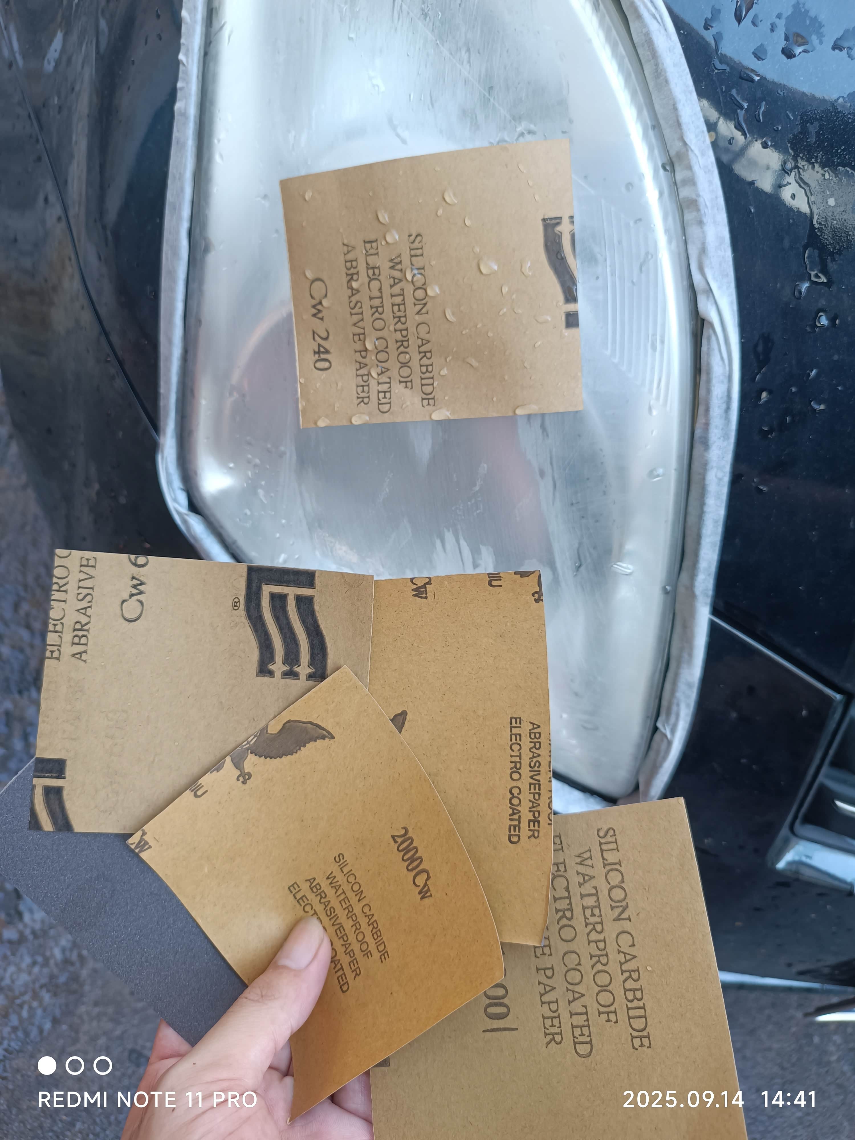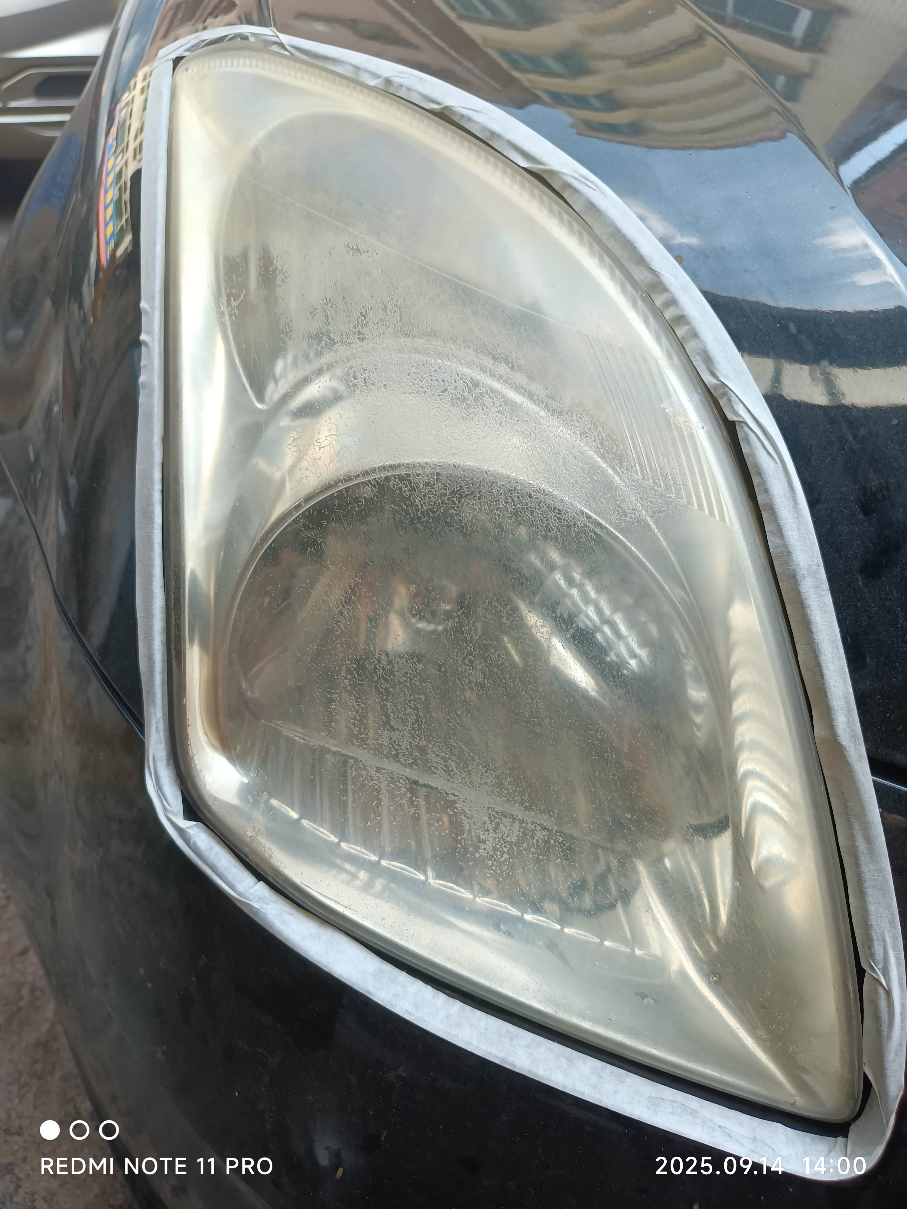 用刀片先刮掉氧化层,然后用240 600 1000 2000目砂纸加水打磨,翻新液加开水后对着大灯均匀喷一喷就搞定了。23块钱的翻新套装,两只大灯弄了一个半小时,据说能管用个一年半载。
