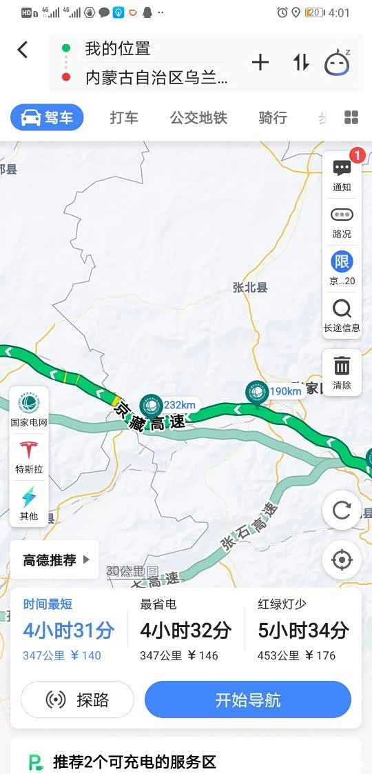 DAY1,10.1早上出发,到乌兰察布,路线如下,出京先走京新,京礼高速,躲避京藏高速堵车,在并入G6京藏,在张家口南服务区充电,张家口服务区为到乌兰察布倒数第二个有电桩的服务区,倒数第一个为 怀安县景家山服务区,为了保守起见,在张家口充电,防止最后一站无法充电的风险。
