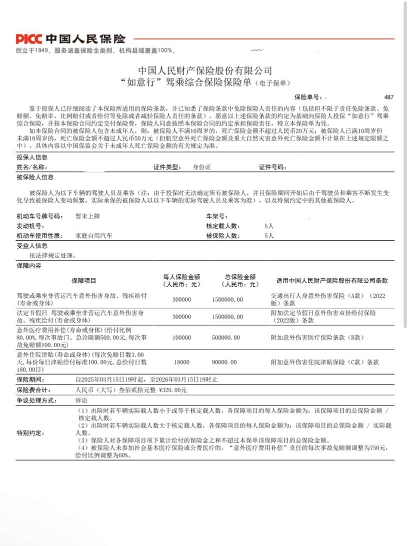 购车第一年投保,总费用为4290元,包含交强险、车船税、全额车损险、司机及乘客座位险、300万保额的第三者责任险、医保外用药责任险以及驾乘意外险,保障较为全面。