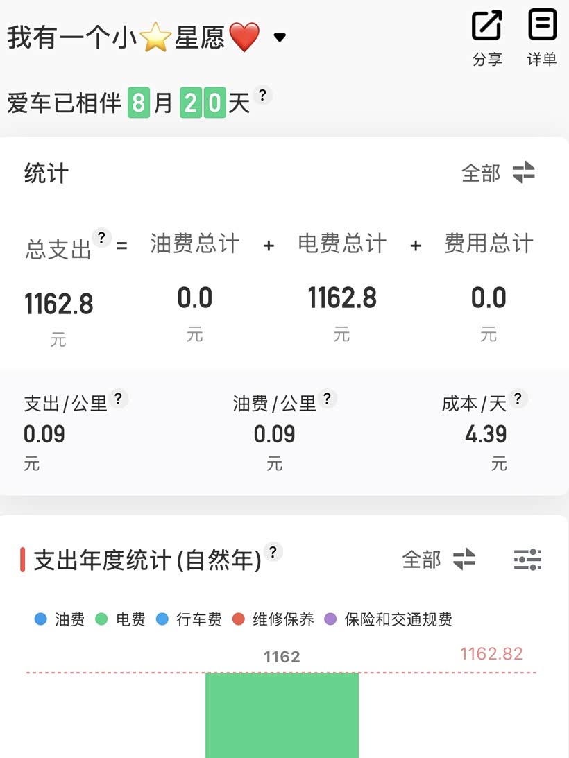 综合9个月的实际用车情况,总行驶里程达13,206公里,充电总花费为1,162元,折算下来,每公里的电费成本仅需0.087元,每天的电费支出仅有4.39元,相当划算。