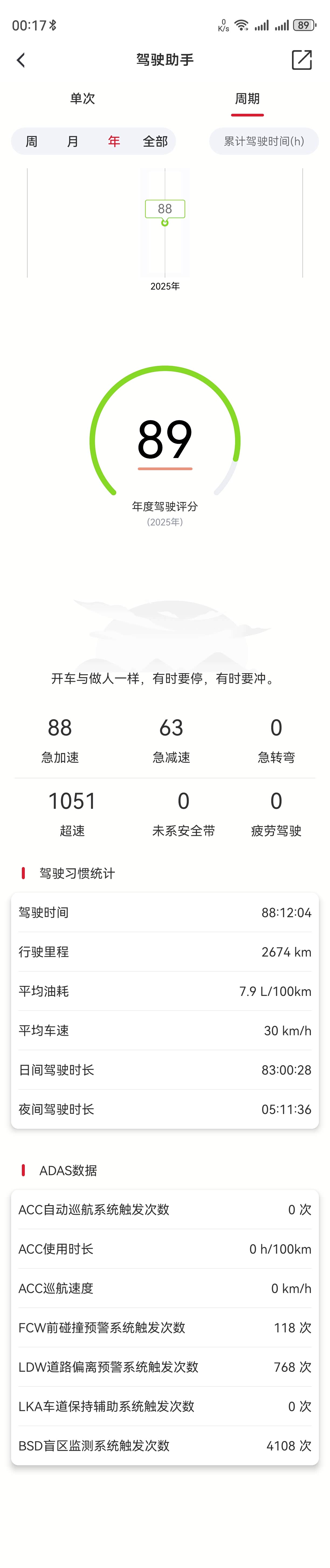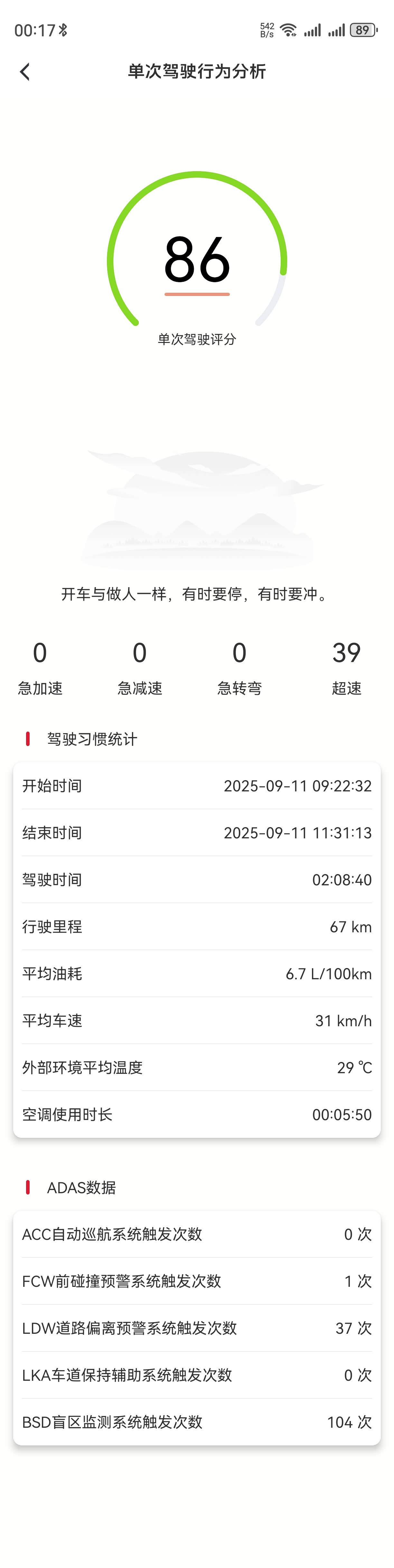 这习惯的变化,在车机 APP 的 “驾驶行为分析” 里看得明明白白。就说 9 月 11 日那次驾驶吧:跑了 67 公里,用时 2 小时 8 分钟,急加速、急减速、急转弯次数全是 0,平均油耗才 6.7L / 百公里,评分还拿了 86 分。再看年度数据,累计跑了 2674 公里,平均油耗从最开始的 8.2L 降到了 7.9L,急加速次数也从 “没数” 变成了 88 次,急减速 63 次 —— 驾驶变平顺了,油耗也跟着下来了,连乘客都吐槽 “以前坐车像坐过山车,现在终于稳了”。