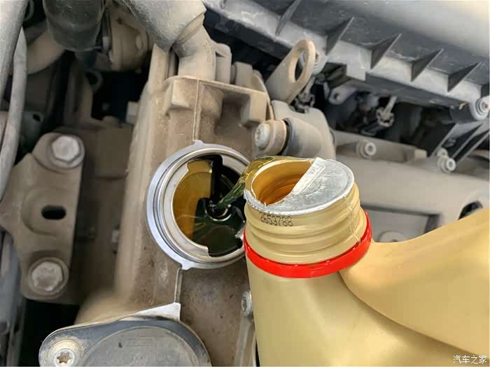 打开机油口盖,开始加注新的机油。