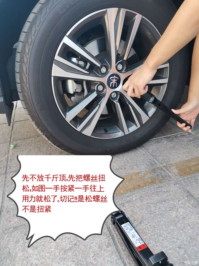 在千斤顶上面也有教程,我相信这个很少车主是有去关注的。上面就有说道得对角松螺丝跟锁螺丝都得对角去操作。手刹记得啦,像这款宋PRO是搭配电子手刹的,不要启动挂挡是不会松的,比亚迪这个做得真人性化