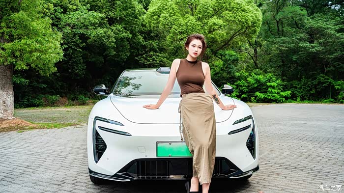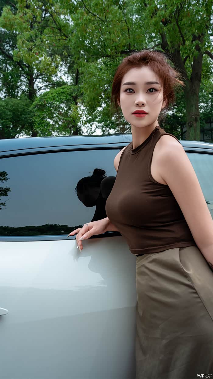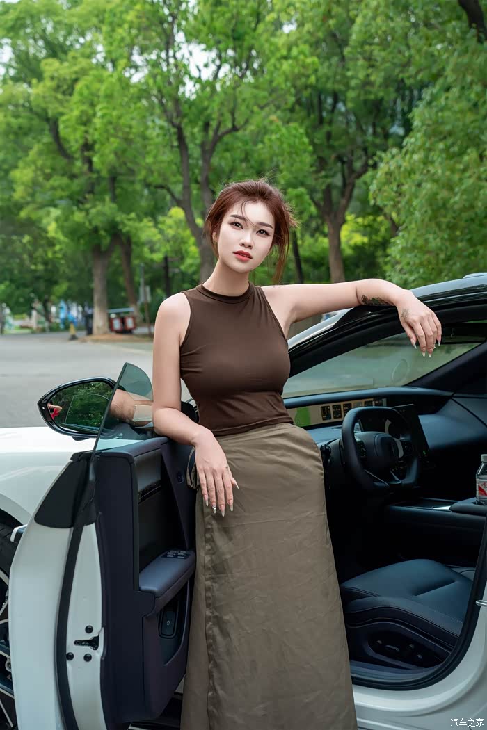 她慵懒地倚着车门,像从时尚杂志里走出来的画报女郎。阿维塔06的流线车身在她身后简直像件艺术品,白得透亮,和她的清新气质绝配。这种不刻意却处处精致的时髦感,谁看了不说一句“心动”!