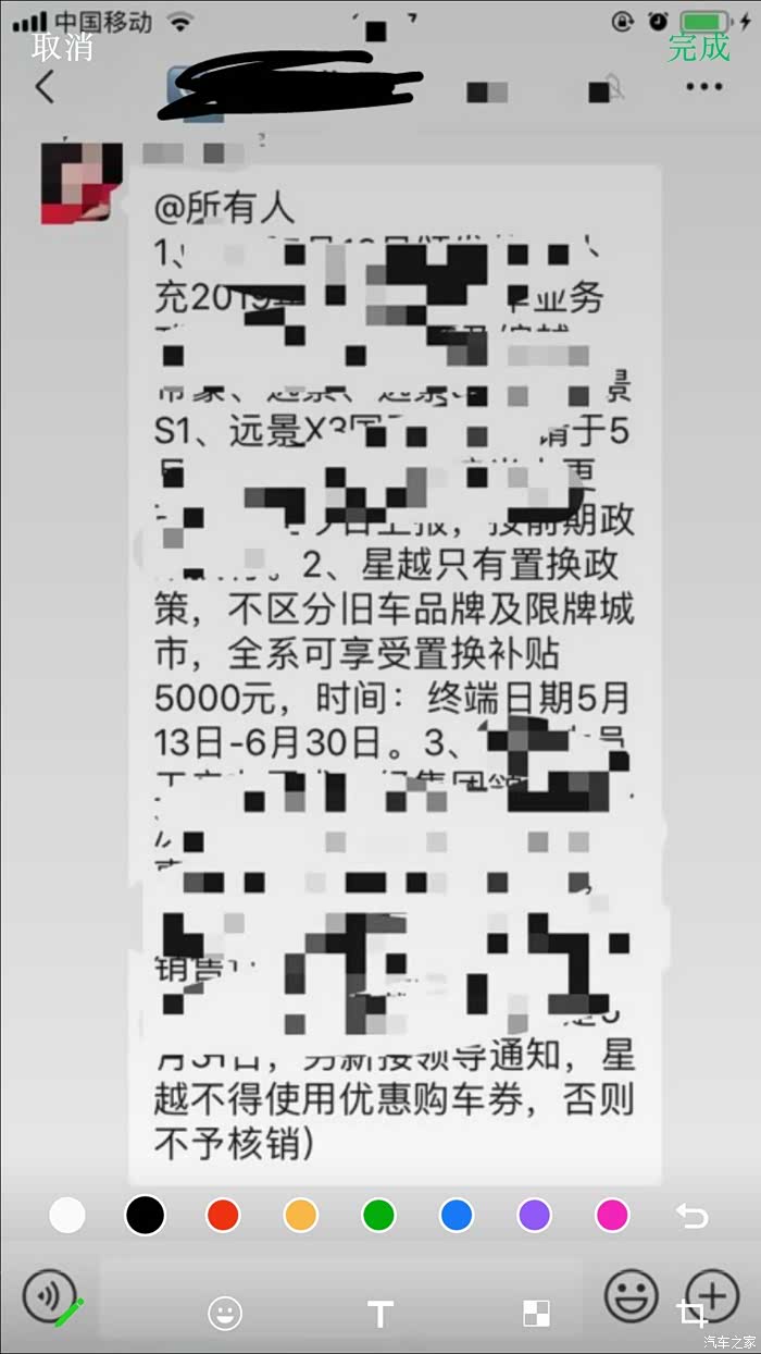 对于吉利星越还是比较满意的,刚开始在纠结是1.5T耀星还是2.0T耀星,纠结了几天,最后还是考虑了2.0T了,不过唯一不满意的是订的车子和展厅的实车配置相差太大了,不过我提车没有加这个配置,基本上免费升级的配置已经比较实用了(如果把电动8项调节加上就更好了),而且加上5000置换补贴还是不错的不过今天收到销售顾问说6月30日之前没有过户好就没有置换补贴了(上图看),感觉吉利这个做法有点闹着玩,而且展车和售车配置更是闹着玩,我定的是黑色耀星2.0T,内饰黑红(销售顾问好像说没有)纠结
