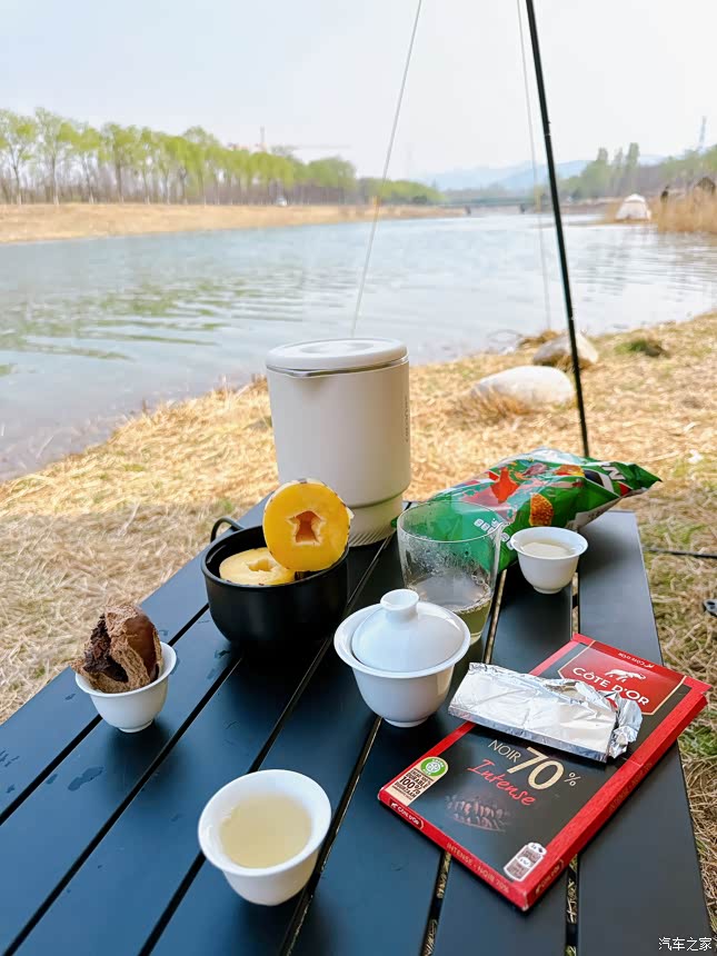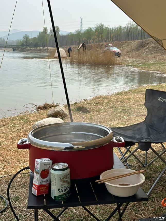 今天出来露营的人还真不少,工作日啊,都不上班吗?找了个人少的地方,本来入口有施工队的一辆ID6堵在入口那里不许进,我上一辆车就是ID6,过去说了几句好话套套近乎,大哥把车挪开给我放行了。然后就沿着小路下到河岸边找合适的露营地点,这里要夸一下胖山的四驱和动力,高低不平的起伏土路,有的地方还比较软,只要注意不要磕到地盘,胖山都一样轻松拿捏。上次都准备好茶具准备在湖边试试外放电泡泡茶喝,结果带的烧水壶是欧版插头没有试成功,这次直接整个2200瓦的电火锅,看看我的车的外放电功率能不能带得起来。