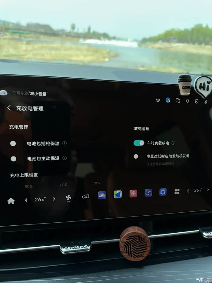 一切准备好后,进入车内,打开车机里的充放电管理选项,进入后打开车对负载放电,这样车就对放电枪的插排输电了。给没用过的朋友们讲解一下,有啥不懂的也可以问我。