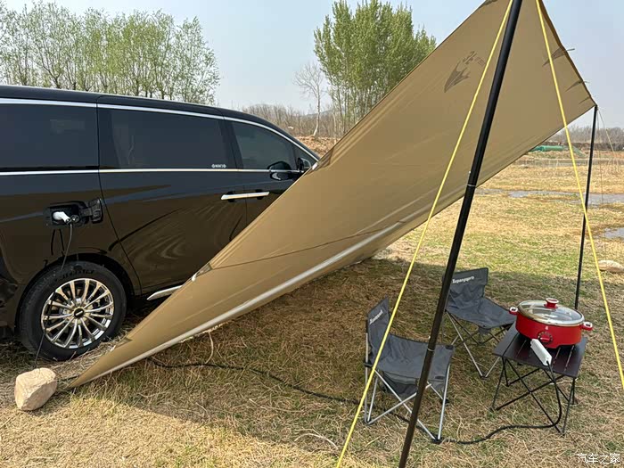 扎好天幕,连接好自备的放电枪,我买的是5米长的,自带公牛插排,配合我车的3.3千瓦的放电功率,能带动市面上大部分的电火锅。想当年我开大众ID6时,想要外放电功能还得花两千多买第三方设备才行,现在我原厂就自带了,开心!