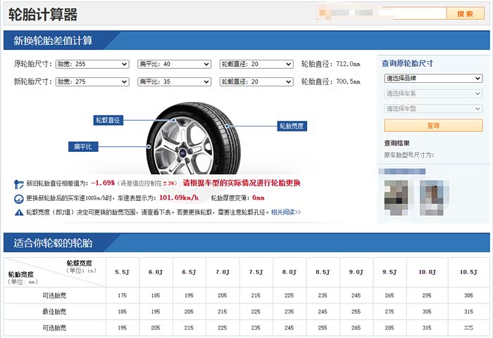 20寸轮毂是9.5J宽度,计算得出9.5x25.4+(15.7x2)=272.7mm轮毂宽度,理论上最合适的太宽应该是275mm,官方标配的是255/40/R20的,网上有换胎计算器,后期换成275/35/R20的也还算合适,轮胎厚度只薄了6mm