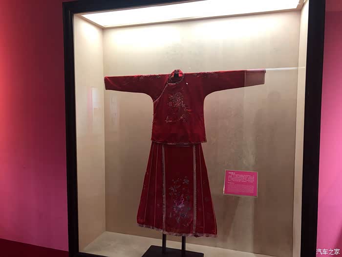 新娘嫁衣是新娘出嫁那天穿的绣衣,一生中只穿一次。绣衣上刺绣蝴蝶与牡丹,寓意美满的婚姻。上衣为红底绣花高领长袄,此种形制流行于清嘉庆道光年间至民国时期。嘉庆道光以后,汉族妇女的衣衫渐趋窄小,长度也明显的收短,下着长裙或长裤,宽松相宜,十分得体。