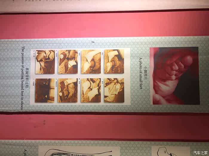 墙上的图详细解说了三寸金莲的形成步骤,整个脚掌除了大脚趾外全部折断裹紧限制其长大,我们看到三寸金莲前面都是尖的,那里放的就是保存下来的大脚拇指。