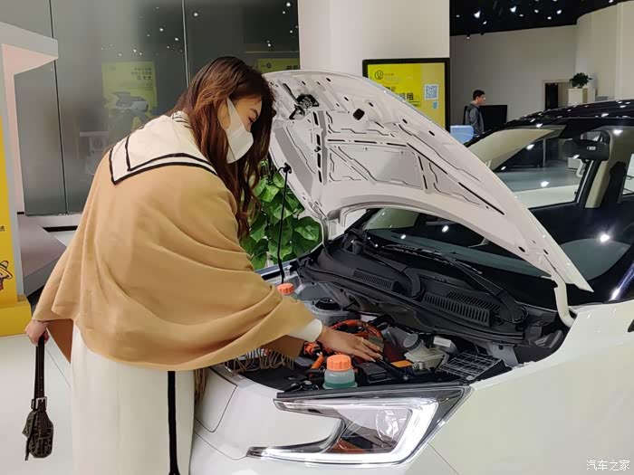 上车之前,还是要例行公事的检查一下车辆的外观又没有擦挂或细小的问题,车漆这些有没有弄好,毕竟是新车嘛,取车前都要看好。打开引擎盖,检查看一下电机这些。