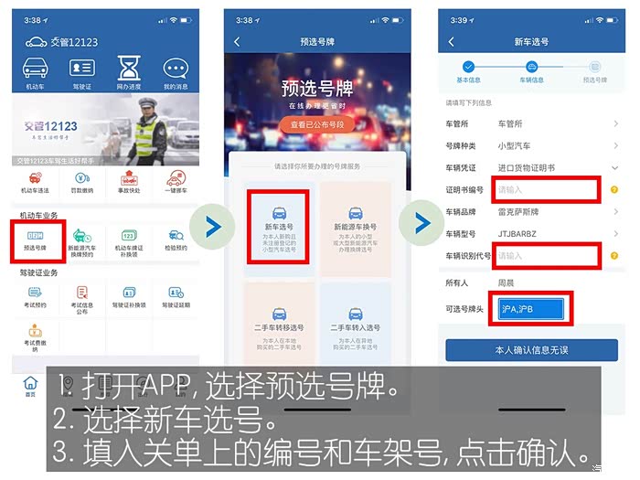 先是车管所人员拍照(之后成为行驶证照片), 抄录检查车架号等信息。然后对于保留原号牌的车就可以回去等车牌和行驶证了(一般第二天会做好)。对于不保留原先号牌的则需要进行选号, 选号可分为手机选和PC上机选两种。大致差别能想到的是电脑上选操作方面方便精确, 手机选则可以随时随地。选号过程都有时间限制, 选完号就可以回去或者在车管所等到下午当天上好铁皮。