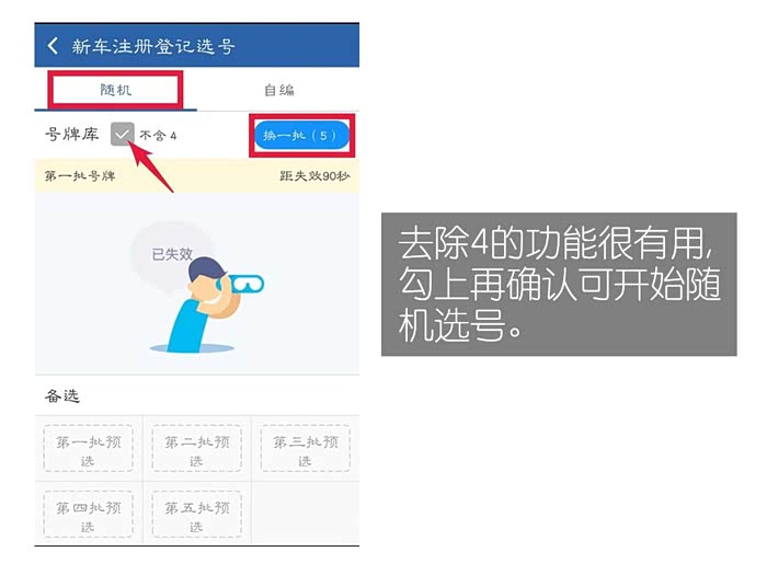 选号分为随机和自编两栏, 即在规定时间内可从随机和自编里选出最终号牌。