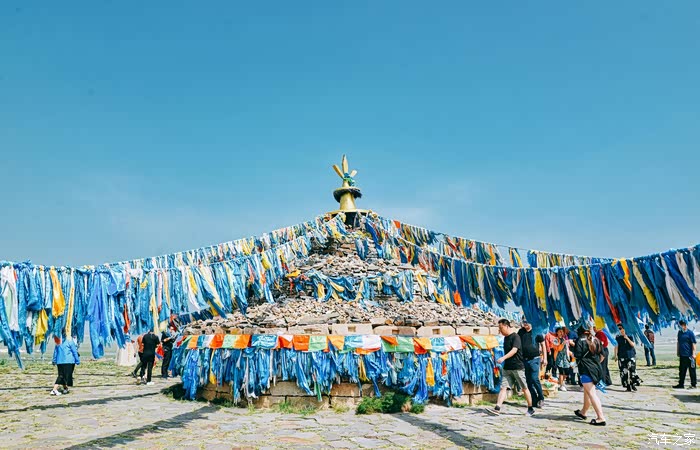 敖包前的石碑敖包的蒙古语直译是“堆”,但真正的含义以及起源都离不开萨满教。敖包是萨满教的祭神载体,是萨满教的法师场所。以石块组成,有些顶端有旗杆和吉祥彩色布条和幸运之旗,象征人们的虔诚心意。萨满教的神职人员“博”、“列钦”在做法事的时候,要在敖包旁进行,民众也会自动聚集到敖包旁,献上贡品,包括酒、水果、点心、肉、布匹等,仪式结束后,萨满教主持者再分给大家享用“福果”。祭敖包就是通过它祭天地、祭祖、祭水火等,祈求风调雨顺,人畜兴旺平安等。一般分为家族敖包,嘎查(村)、苏木(乡)敖包,旗(县)敖包,最大的敖包在蒙古国的不尔罕山上,那是成吉思汗的敖包,蒙古国每年都有隆重的祭敖包仪式,总统也出席仪式并亲自祭拜。敖包的形式和位置很多。比如在路边有敖包,那是祈望保佑道路畅通的;湖边有敖包,那是祈望保佑圣水长流;草场边有敖包,那是祈望保佑水草茂盛的……他们无一例外是在被保护物的上方,他们大小不等,但同样庄严。去过蒙古国的人都知道,它们的路边就有很多敖包,凡是路过者,无论是哪国人,一律下车祭拜,围着敖包顺时针转三圈,手中拿着石头往上面加,还有酒、马奶、牛奶以及其他食物或能够代表你的心意的任何物品,虔诚的放在敖包上,心中许愿。由于敖包的位置通常很显著,在当地的知名度也很高,游牧人在辨别方位时自然会想到以此为坐标,叙述时就说在哪个敖包附近、哪棵树的前面、哪条河的北面等等,久而久之,敖包也有了标志的作用,各部落之间或者国家之间的界桩就以敖包为标记。汉语文献里也写作“鄂博”、“鄂包”等。在清代的一些地图上,都标着作为国界的敖包。但这是敖包后来的延伸意义,原始意义上的敖包就是萨满教的产物。