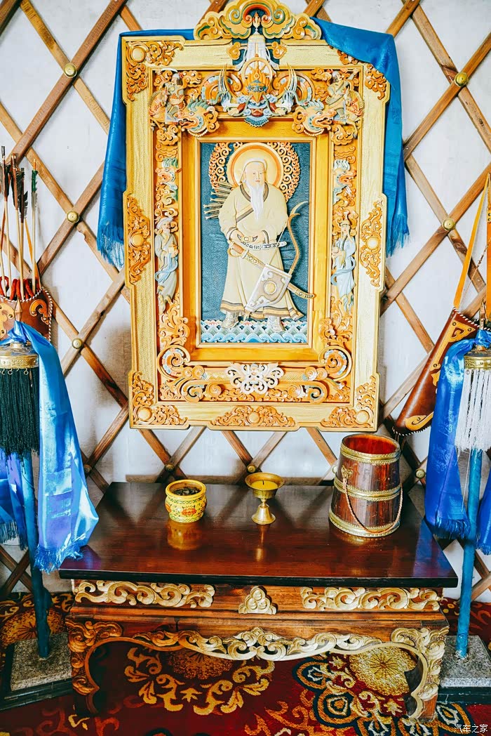 在广袤的草原,连食物的气魄都与众不同。在蒙古人的菜谱中,只有纯粹的肉和奶,硬核大气,绝不会琐琐碎碎。喧宾夺主。蒙古包内一角,成吉思汗的挂像
