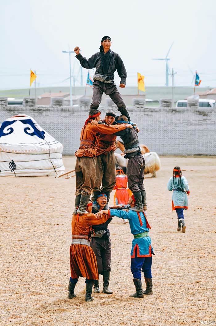车驶入内蒙的地界后,干净的公路在开阔的草原上一直延伸到视野的尽头,心情也变得莫名愉悦。蓝天白云,青草悠悠,牛羊满山,梦中的草原便是这个样子吧。正午的阳光照在身上仿佛是要把人融化,手轻轻的伸出车窗外想要去触碰像绸缎似的蓝天,像棉花糖一样的白云,像水洗过似的绿草。花儿们躲在草地里,像含羞的孩子,偷偷的露出嫣红的脸儿。一路上风和日丽,几个小时之后,终于抵达了格根塔拉草原旅游区,在旅游中心办理了酒店入住之后,工作人员告知草原上有迷你那达慕的表演,有呼麦,歌舞等文艺表演,于是我们便带上相机迫不及待的走进草原。