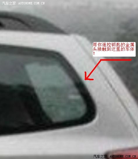 然后将你的遥控钥匙的金属尖与车窗旁的金属车身接触,如下图红圈内: