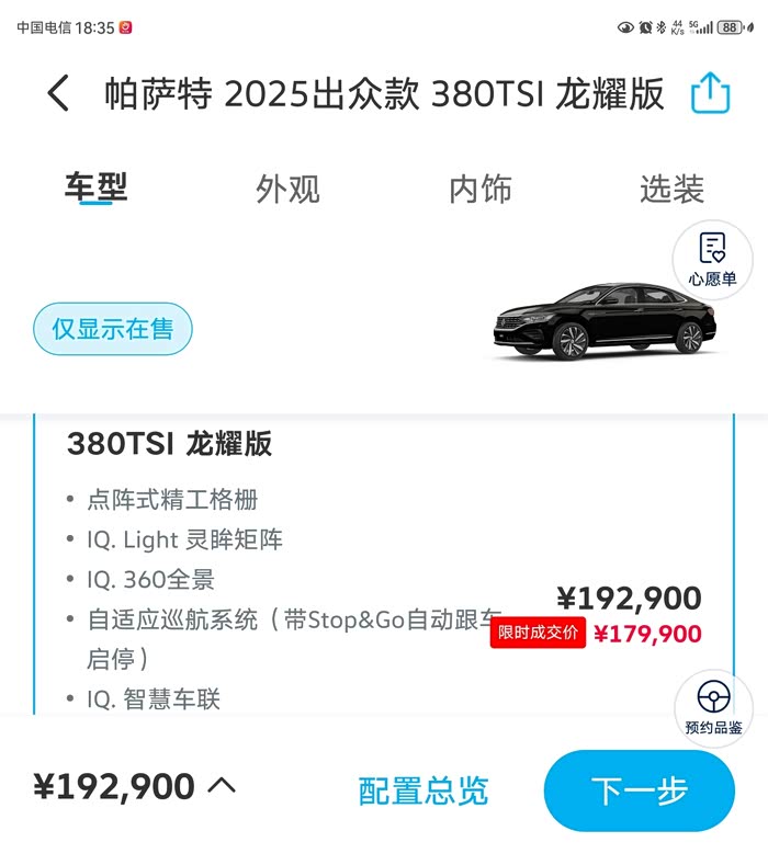 试驾结束,帕萨特380TSI龙耀版以其出色的动力性能、豪华的内饰配置以及先进的安全技术,为驾驶者提供了一次舒适、安全且充满乐趣的试驾体验。无论是商务出行还是家庭旅行,它都是一个值得信赖的选择。目前在官网价格是一口价179900,叠加上店内旧车补贴5000,上海市的旧车置换补贴12000,如果需要金融贷款政策的话还能再优惠14000,裸车价只要148900,真香!如果预算多的话还可以考虑帕萨特pro,智能化车机更高,颜值也更棒!