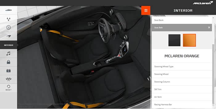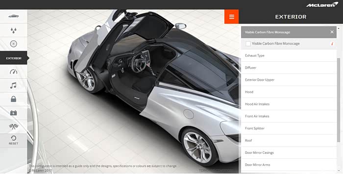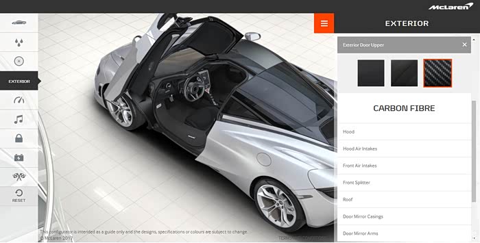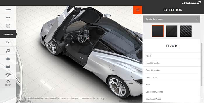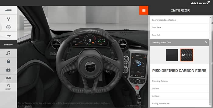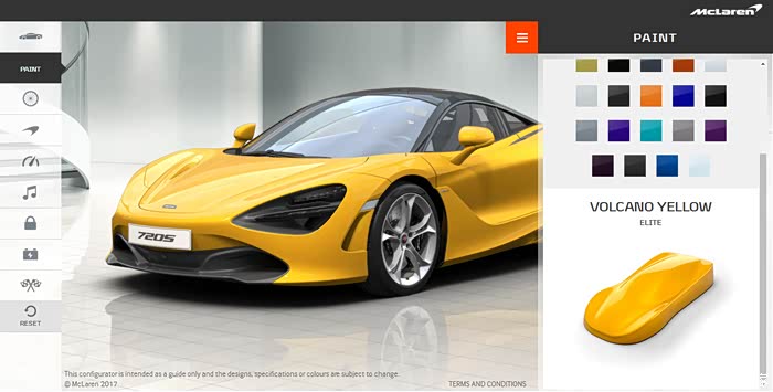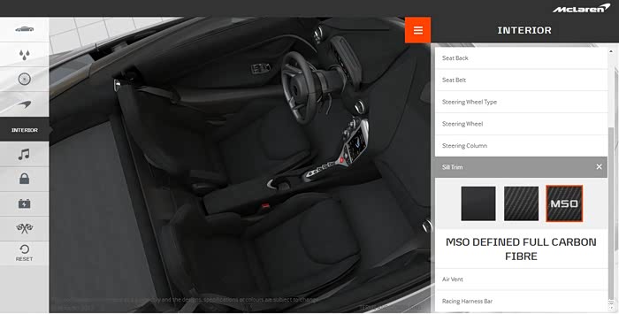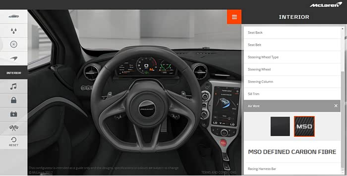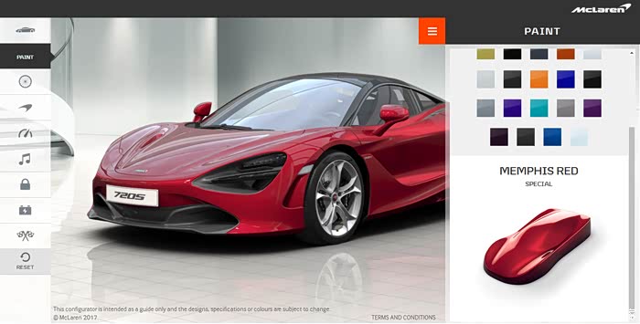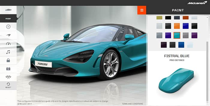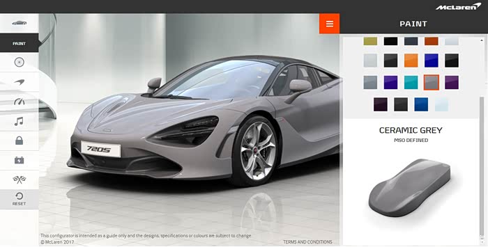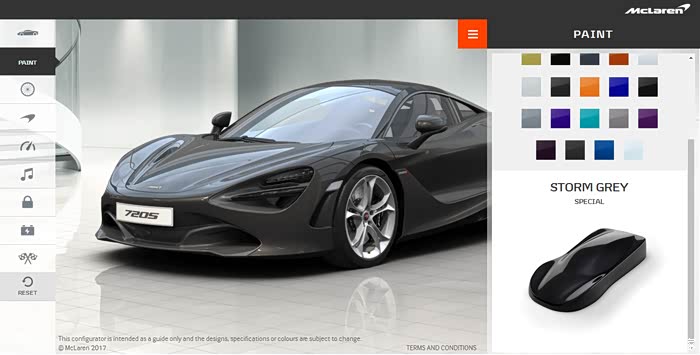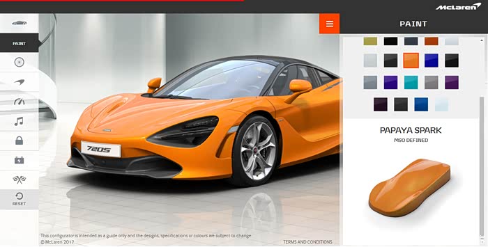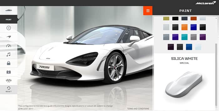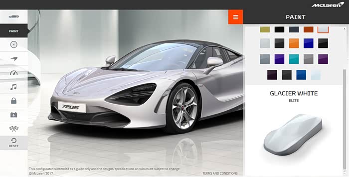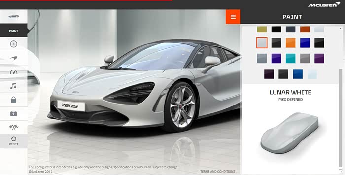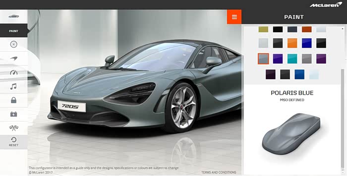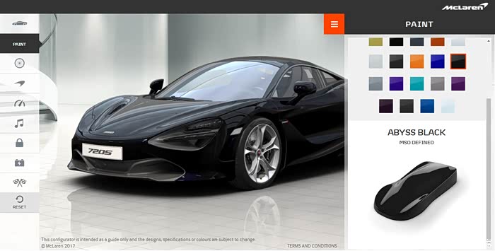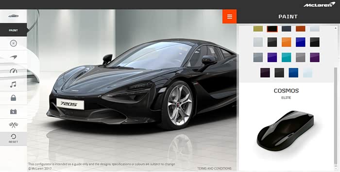以上展示的是720S配置器中的所有可选漆面,除此之外还有来自MSO部门的隐藏菜单,迈凯伦特别定制中心通过MSO高级定制部门,为客户提供近乎无极限的定制服务,定制内容包括独特的外部车漆,在MSO的工程师手中,会利用钻石将其呈现出一种全新的生命形式 —— 将钻石研磨成粉末,打造一款犹如星空版的车身涂装全新选择。