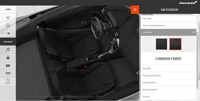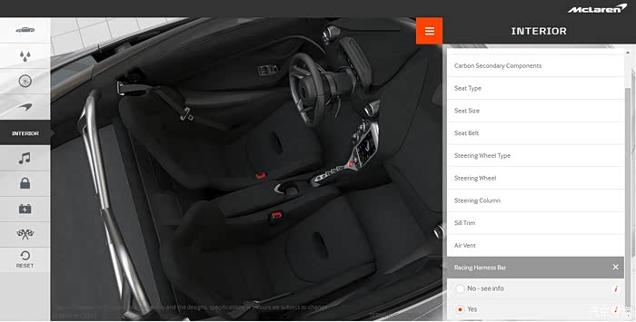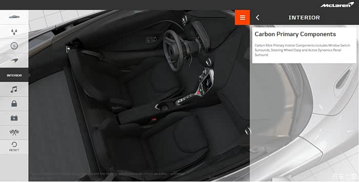 内饰部分,包含了内饰颜色材质、碳纤维装饰件及相关舒适性配置的选装