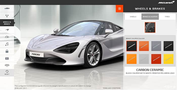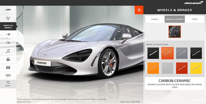刹车部分,720S标配碳陶刹车,卡钳涂装及LOGO颜色有8种不同的搭配