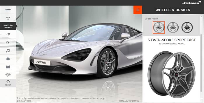 720S共提供三款轮毂,其中包括一款五辐铸铁轮毂,一款五辐轻量化锻造轮毂及一款十辐超轻量化锻造轮毂