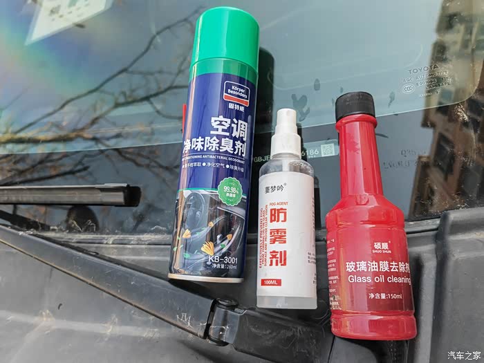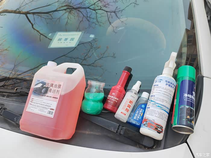 所需工具:准备的工具都是此车后备箱的东西,可谓五花八门啥都有,老父亲比较专注网购一些车上物品,而且成箱成套的买,一应俱全,也是拦也拦不住。玻璃油膜清洗剂,油膜净玻璃水、内饰清理剂、空调净味除臭剂、除尘水晶泥(孩子之前玩过的,顺手拿来用)、防雾剂等,大小7瓶,这次主要用到了4款材料。