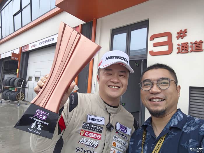 然后第二天上午呢下起了毛毛细雨和CEC一起在这个赛道上举行的比赛的还有超吉联赛 和莲花杯的比赛。超吉联赛Pro里面有大家比较熟悉的车主,就是堂主撩车的堂主,他这次开了14号赛车。唉,虽然只跑了第四,但是却捡了一个第三的奖杯回来。你们也可以看到堂主真的是非常的开心