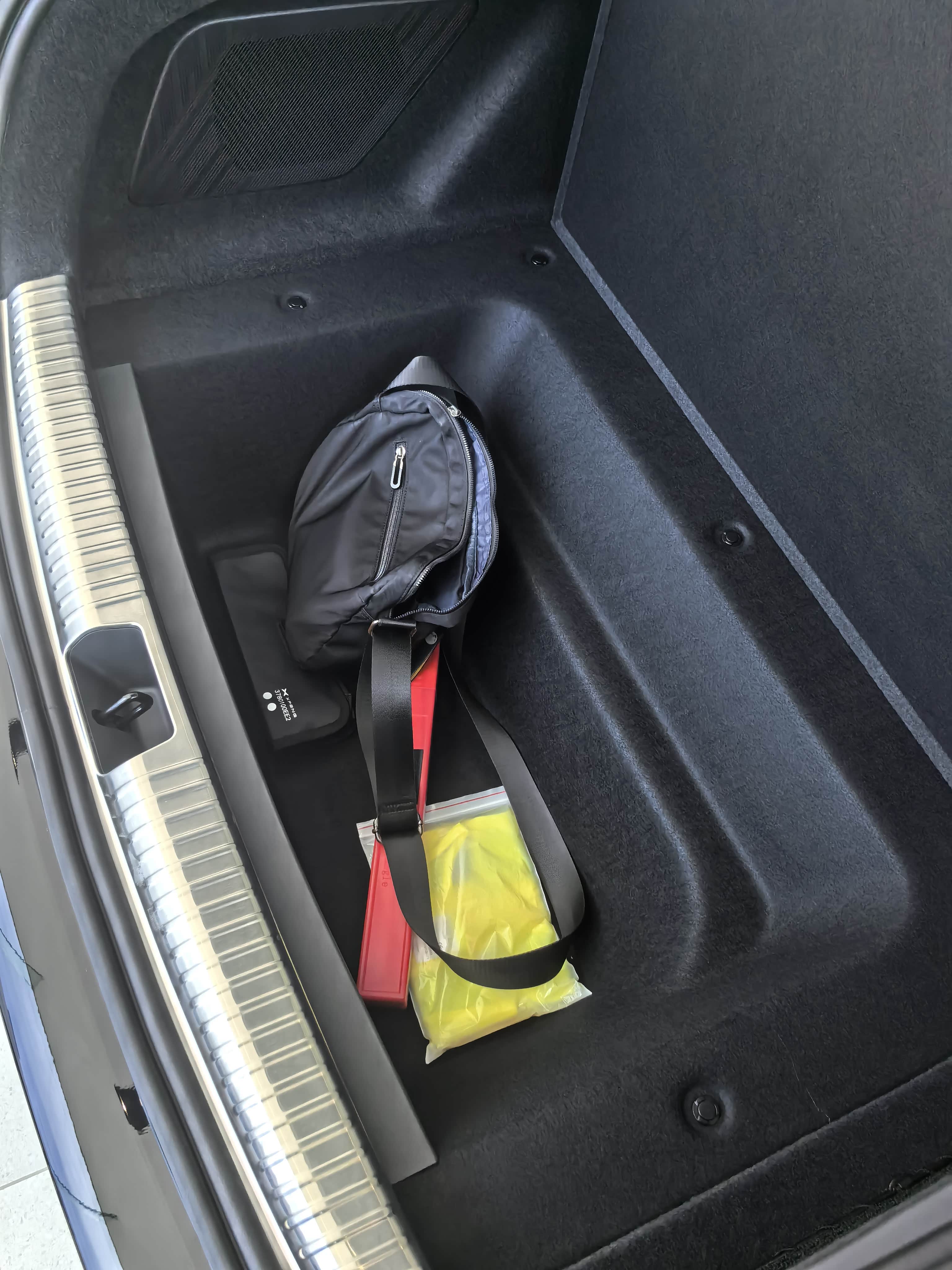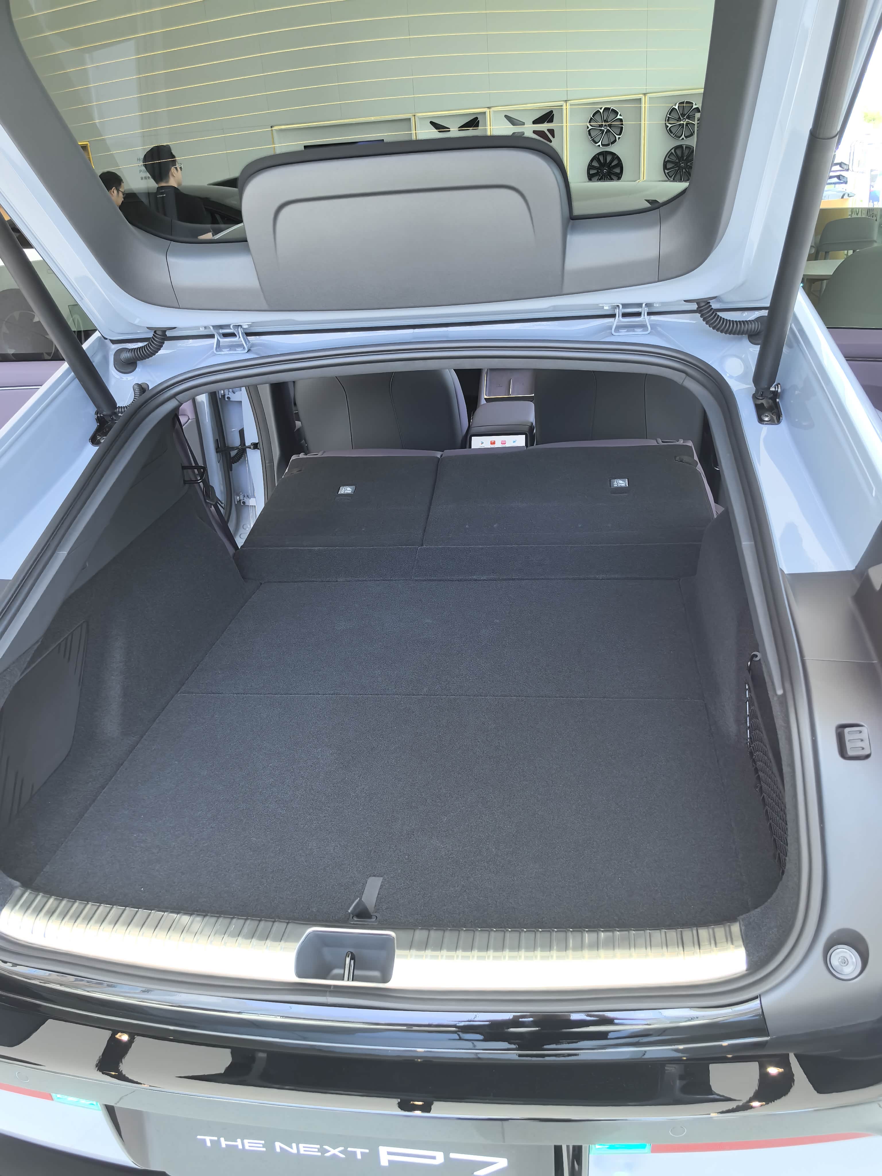 ④该车后备箱开启位置在“XPENG”logo的上面,按钮位置不需要弯腰就可以直接打开后备箱,非常方便。另外,该车打开后备箱后,其后备箱盖+尾部玻璃是整个打开的,跟非掀背车型相比较,它的后备箱亮度明显会高很多。