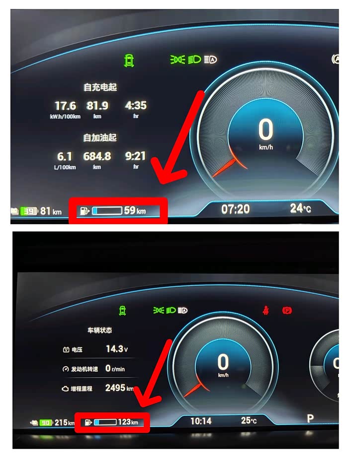 最后到家后油箱显示还剩一格油,剩余燃油续航123公里,第一次加油前油箱只剩59公里。