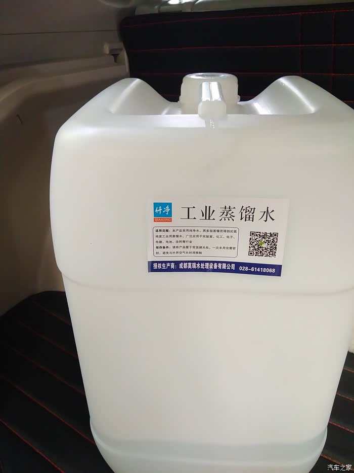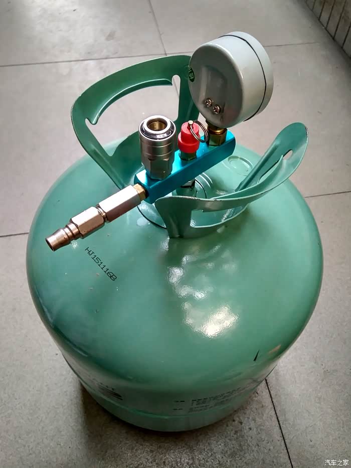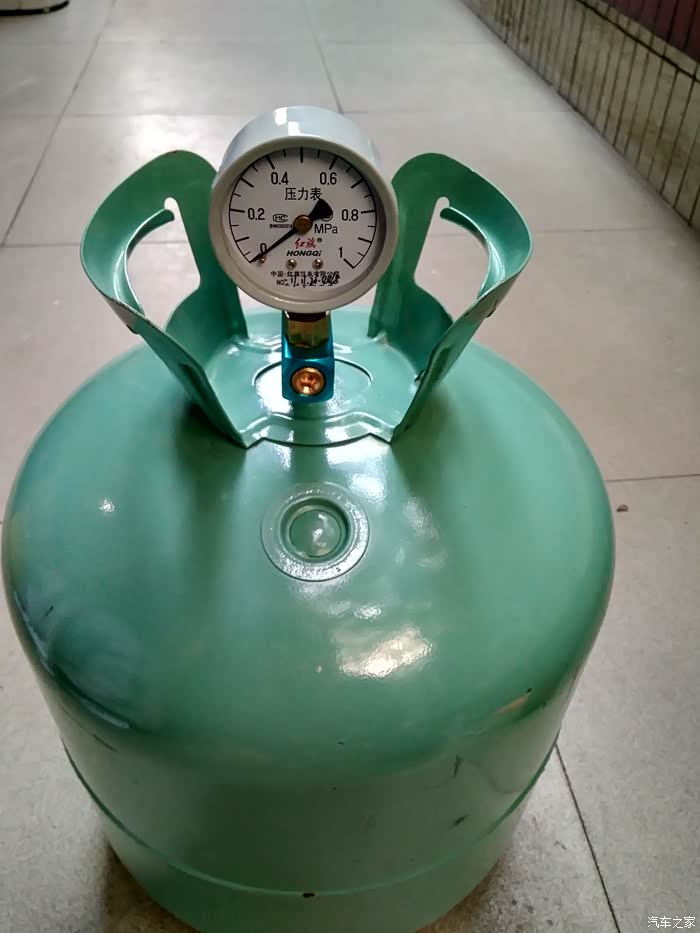基于上一辆QQ车管路锈蚀的经历,此次打死不会用含杂质的自来水清洗冷却系统了,本来是想自制清洗用蒸馏水的,用硅胶管和高压锅制作,实验了一下太慢了,光不停的换冷凝水都要把人累死;所以上淘宝购的工业蒸馏水,淘宝卖家离单位10多公里算很近了,55元买了一桶25公斤足够用了,用指针万用表测了下蒸馏水电阻为50千欧。<br/><br/>3.准备的工具<br/>隆重介绍自制的便携高压气罐,用一搞空调的朋友送的空R22罐子改装,2分接头的三位气路分配器为核心,上装出气用气动快速接头、压力表和红色安全阀(8公斤),侧面用进气气动快接连接单向阀作充气用;关键零件是M12x1.25(钢瓶接口)转2分不锈钢转接头,开始组装用的生料带密封,后发现会漏气,后改为液态生料带,密封效果非常好。