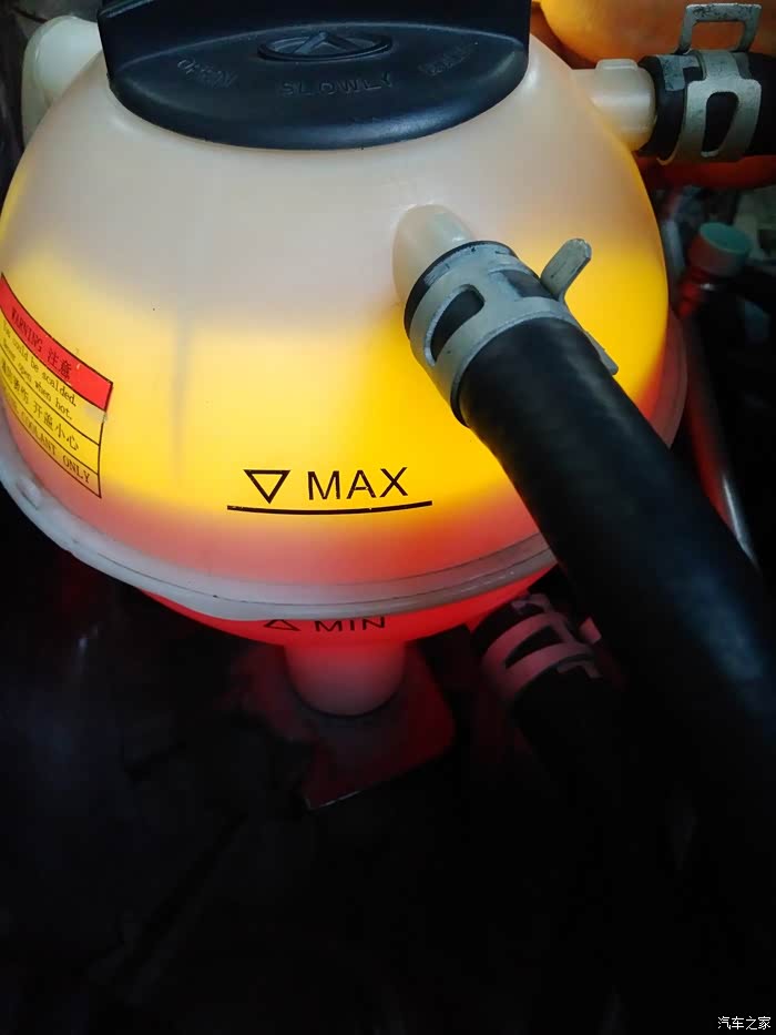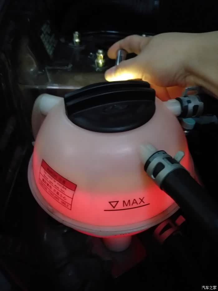 后面的操作没时间拍图片了,主要是拆放液螺丝太累了,而且操作步骤也没按计划中的来,因为发现空间太小不好操作,抽水泵积液的过程就没做,最后只做了放旧液,高压气冲积液,又用蒸馏水清洗了2次,后放出的液体基本看不出颜色了。过程中印象深刻的就是虎5的散热太好了,清洗时发动汽车怠速运行了好久都没热,当时室外温度在11度左右吧,后面只好踩着油门提高转速到2000转等了比较久节温器才打开开始大循环,不过散热风扇一直没转,没时间等了,节温器开了就行,接着进行操作。<br/>