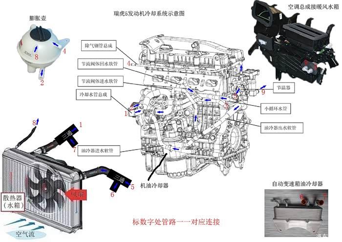 冷却液流动方向讲一下,从水泵处开始,就是图中冷却水管总成,标数字1那根顺着弯连到发动机体上的位置对着的就是水泵,防冻液通过发动机内部水套从节温器总成处流出,顺着小箭头方向流动,注意节温器总成有5个出口,朝上的那根是接除气钢管,另一头接膨胀壶4号接头,朝前那根5号粗管(里面有节温器,防冻液到87度开启大循环)接的水箱进水口5号接头,底下靠发动机里面那根是发动机小循环回水管,接到冷却水管总成,靠外那根是接机油冷却器进水管,中间有个三通分流一部份到节气门,都接回到冷却水管总成上,朝后那根9号接的暖风水箱进水管,暖风水箱出水管也接回冷却水管总成。水箱和自动变速箱油冷器属于大循环,回水都流回冷却水管总成。<br/><br/>上面说了这么多有点乱,其实就是节温器关闭时冷却液走小循环只通过发动机、暖风水箱、机油冷却器、节气门四大部分,而节温器打开时大循环冷却液除了以上部分还通过水箱和变速箱油冷器。<br/><br/>还有需要注意冷却系统是个封闭的加压循环,密封加压是因为发动机正常工作水温需要在90-100度间,但常压下水在100度就烧开沸腾了,必须要加压提高沸点(大家都知道在高山上气压低要用高压锅烧水这是一个道理)。而且膨胀壶的盖子同时也是个压力开关,当水温过高(比如散热风扇损坏或外部环境温度过高造成无法散热等极端情况)冷却系统内部压力达到危险高压时会自动顶开盖子内弹簧卸放系统压力,高压蒸汽液会通过盖子从膨胀壶边上放出保证系统稳定,所以平时需要添加冷却液时注意不要在热车时打开膨胀壶盖防止烫伤。<br/><br/>另外根据虎5坛友更换经验只能更换出大概5升左右的旧液,但说明书(冷却液容量7.5±0.5升)上有更多,而以前问过4S师傅和淘宝卖家都说3桶2升装防冻液就够了,这令我感到疑惑。这次自己动手想尽量多的把旧液排出,经过分析,想要完全更换防冻液首先要找到整个冷却系统的最低点,实际观察确定是自动变速箱油冷却器处(自动档虎5并不是水箱放液处),但还有问题就是各处存在的低洼点即使用高压气枪冲刷也无法有效排出旧液,特别是水泵接铁水管处明显有个低洼点,只有用吸取并加蒸馏水清洗的方式稀释并排出,计划准备用细的特氟龙管从3接口处插入至水泵处吸液。<br/>
