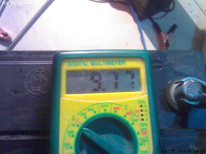 5、在监测的最后阶段,最好不要离开了,经常观察电压表变化。当电压开始跌落到第一平台时(速度很快),看是多少伏能稳住。这个时候,放电也就结束了。在不烫着的的安全操作前提下,把放电装置尽快拆除。也不要急急慌慌的,没有把电瓶一下子就损坏那么严重的后果。我这个电瓶电压跌落的第一平台是9.77V,拆除放电装置后,空载虚电压会立即反弹到11伏以上。见下图