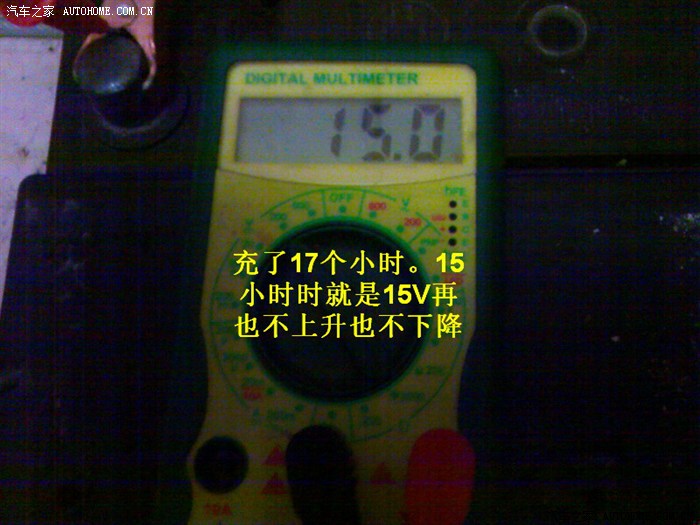 换回自动充电机,仍然不转灯,电压开始回落到15V ,到第17小时也不回落也不再上升 。我在操作过程中曾经向蓄电池中注入蒸馏水,想必是电解液比重小了。见下图