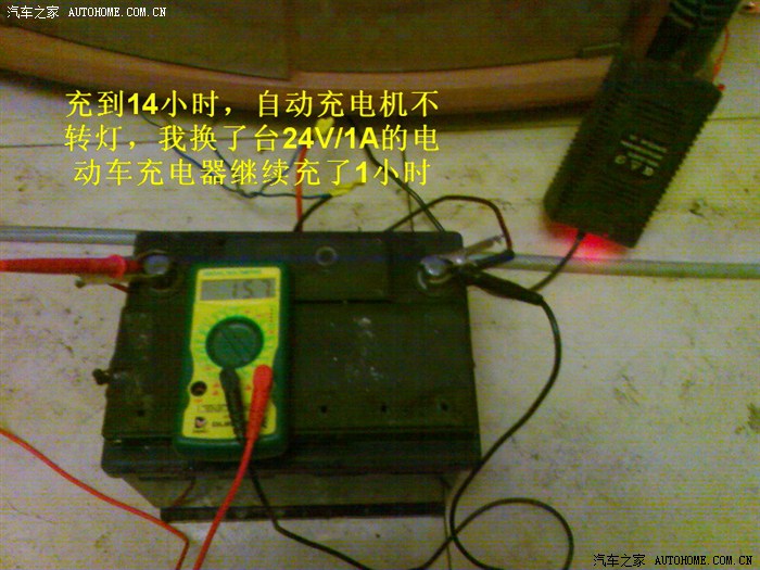 充了14小时后不转灯,换了台24V/1A的电瓶车充电器给电瓶又加充了1小时。见下图