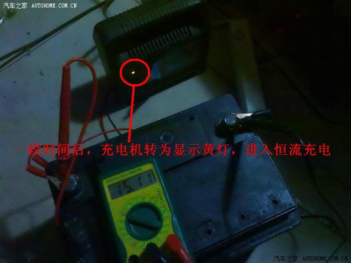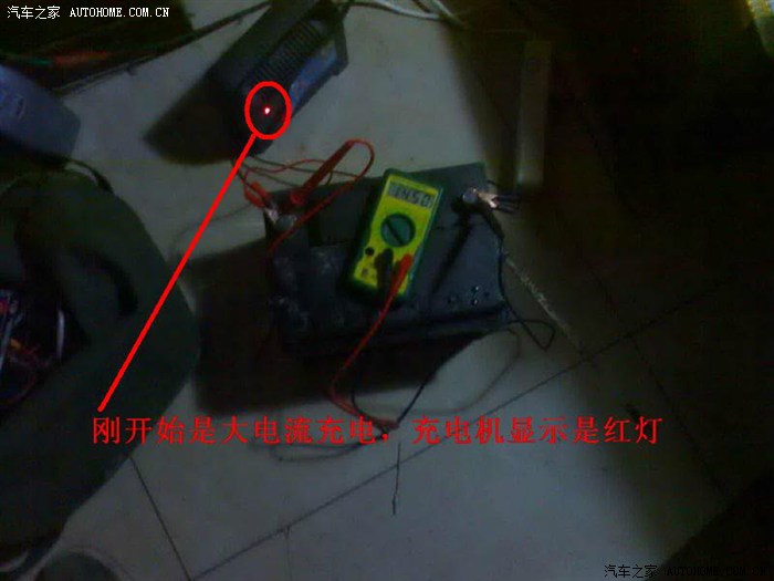 6、把放完电的电瓶再接入充电机。市场上的反激式充电器经常会不转灯,也就是说充电的红灯不能转成绿灯。这是由于进行了一次相对彻底的电瓶修复,电瓶充电充到一定时间后,自身的放电电流大于或等于充电机的充电电流的原因。我这个电瓶,在上面的操作过程中,我曾经注入蒸馏水冲洗了一次,显然,是蒸馏水没抽尽,也不可能抽尽,比重不够。