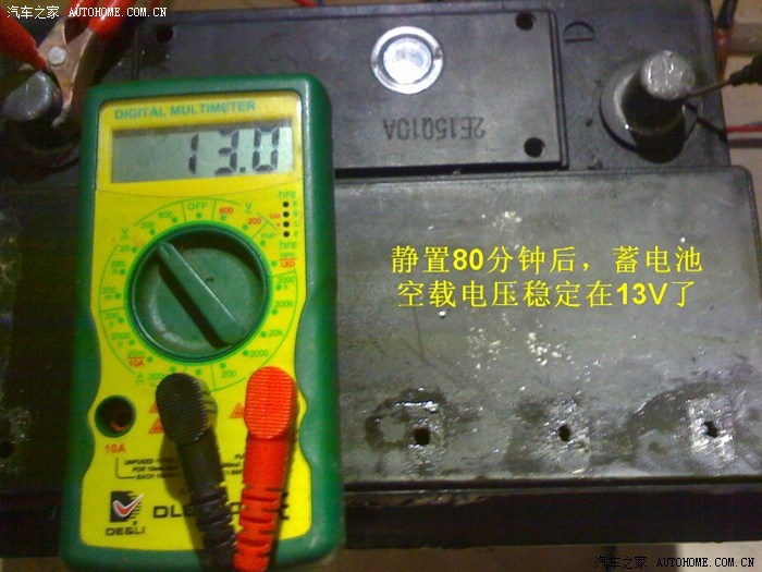 7、拆除充电装置,静置1个小时以上把充电后的虚电压全部释放;然后重新估算电瓶的荷电量。我静置了80分钟,电瓶空载电压由拆除时的15V回落到13V整,再也不动了。稍低于充满电的静置电压13.4V,不缺水,只能说明是电解液比重不够。见下图