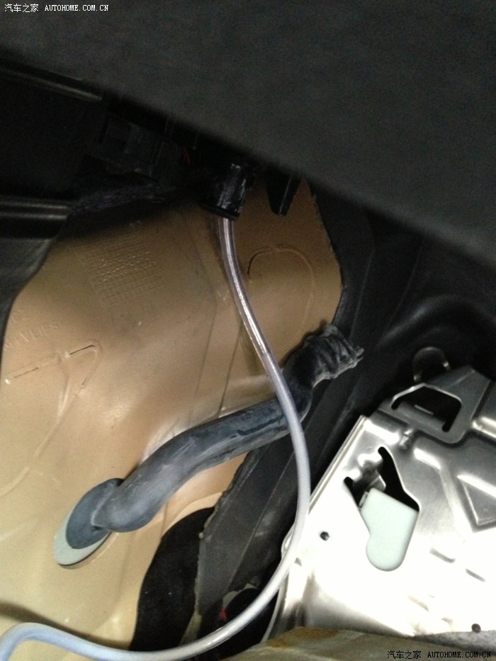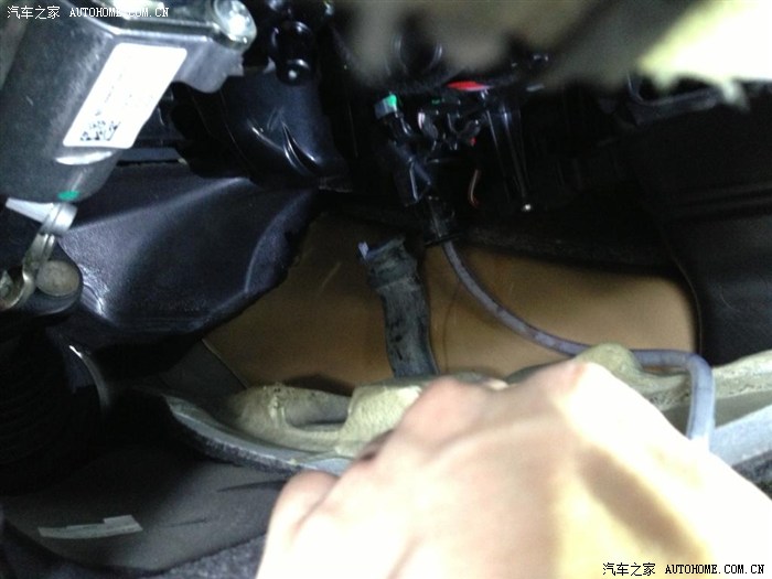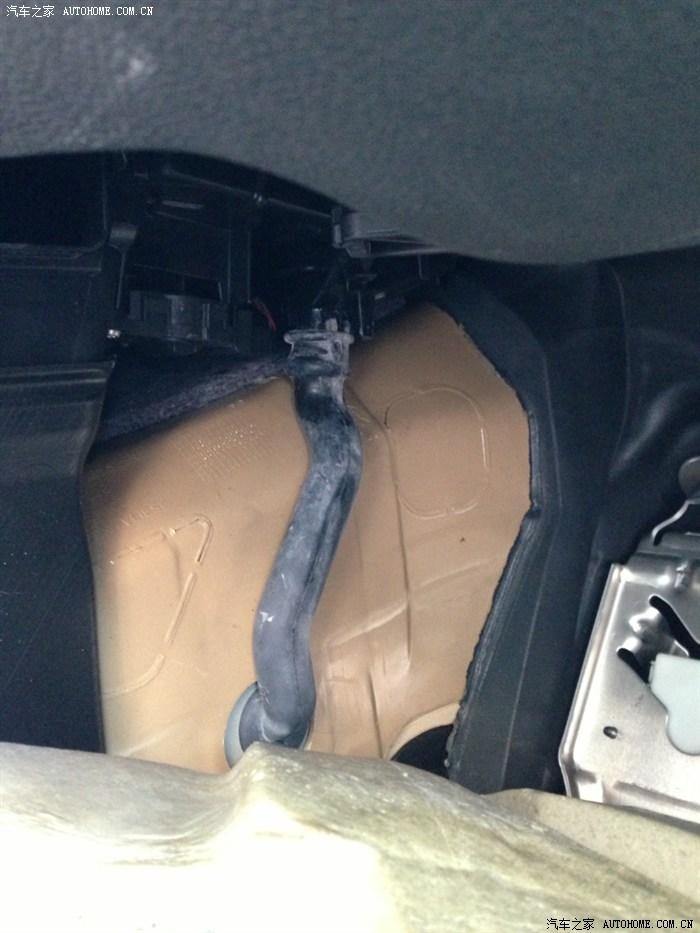 但是!各位看官请继续往下看!由于要换空调滤芯,我也把副驾驶位的盖板拆除了,好奇心驱使我也扒开左侧的地毯看看,见下图