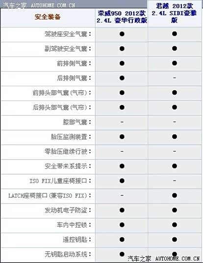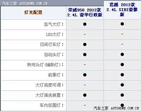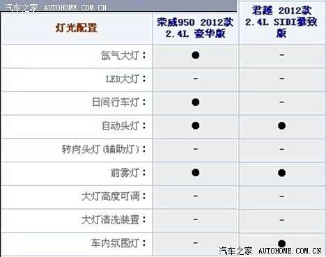 通过上面荣威2.4豪华版,君越2.4智雅版的对比我们可以看到,荣威950比君越多了无钥匙启动,多功能方向盘,定速巡航,倒车影像,内置硬盘,氙气大灯,日间行车灯,后视镜自动防炫目。君越2.4智雅版比荣威950多了胎压监测,全景天窗,前排座椅加热,安吉星定位服务,车内氛围灯。