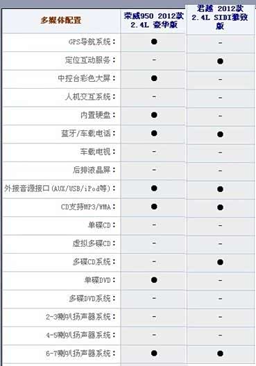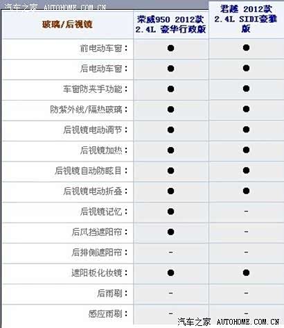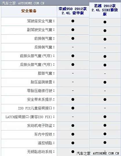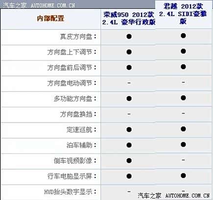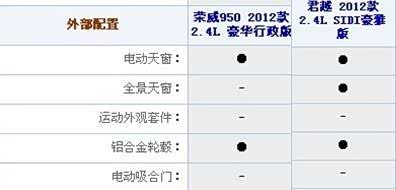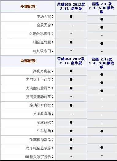 一个是通用别克在中国中型车市场上占据一席之地的君越,一个是上汽一直努力,想打造成高端自主品牌的荣威950。作为消费者,到底该选谁?汽车之家曾经做过荣威950的导购***,(http://www.autohome.com.cn/advice/201204/322058.html)***里只对荣威950的5款车型做了对比,相信喜欢这款车的消费者如果买这款车的话第一个考虑的竞争车型肯定是君越。所以下面我将对价格最相近的两种配置四款汽车的配置做详细的对比。