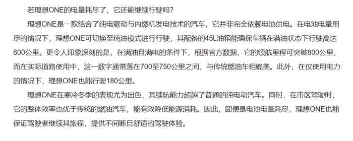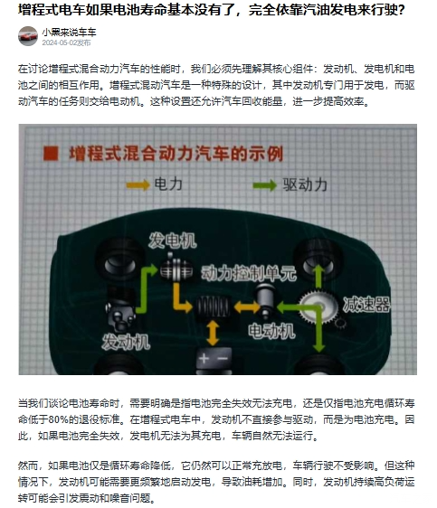 增程式电动车的特点:理想汽车是一家生产增程式电动车的品牌。增程式电动车在电量不足时会依赖发动机为电池充电,进而驱动车辆。然而,发动机并不直接驱动车轮。