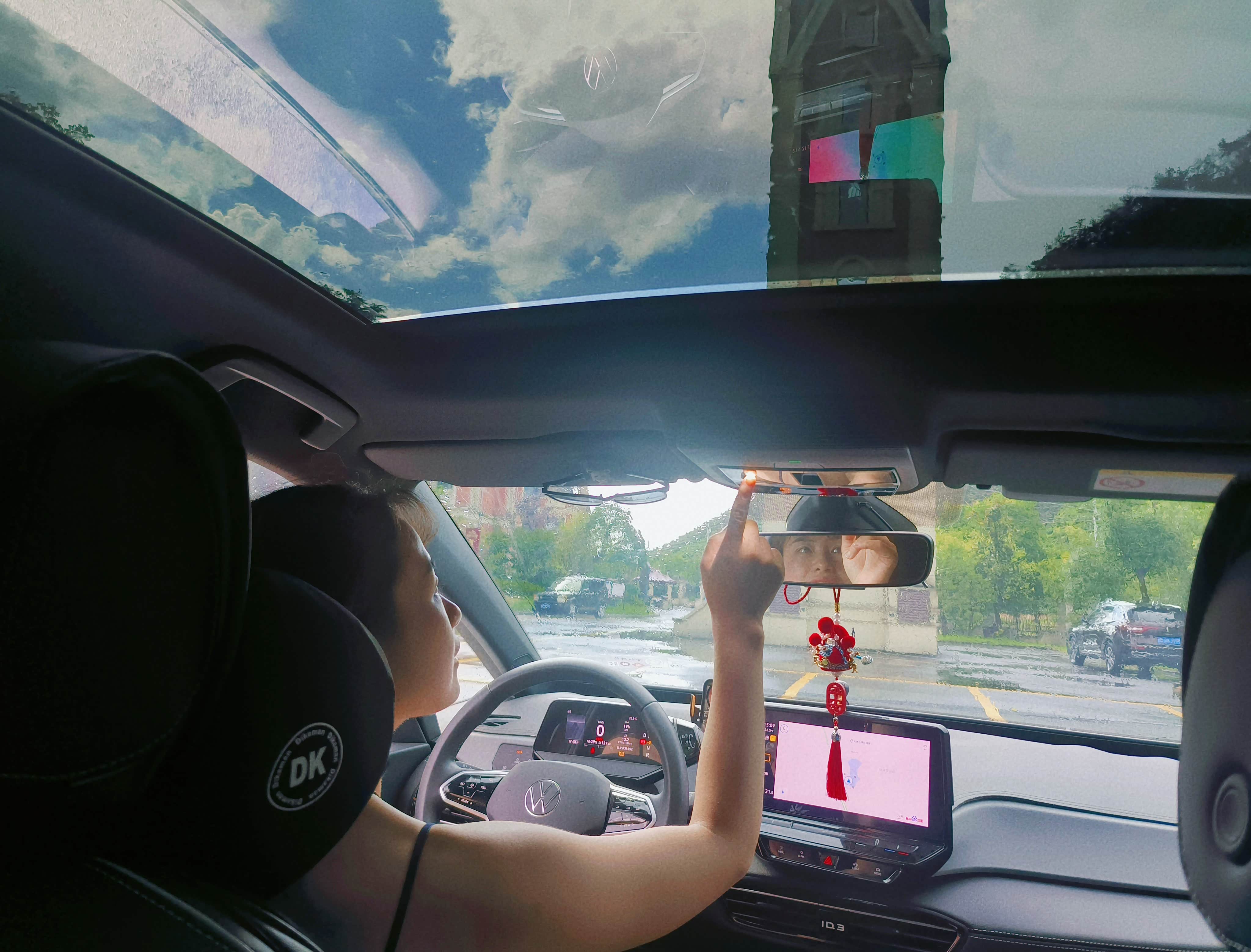然而,天有不测风云,正当我们沉浸在这份美好之中时,天空突然下起了雨。雨滴越来越大雷电交加,我们赶忙上了车,媳妇见状,并没有丝毫的慌张,反而兴奋地打开了ID3的天幕,让雨水自由地洒落在大天幕上。她靠在座椅上,闭上眼睛,静静地聆听着雨声与车窗外世界的交响乐。那一刻,我仿佛看到了她内心世界的宁静与满足,也感受到了ID3带给我们的不仅仅是出行的便利,更是一份生活的情趣与品味。