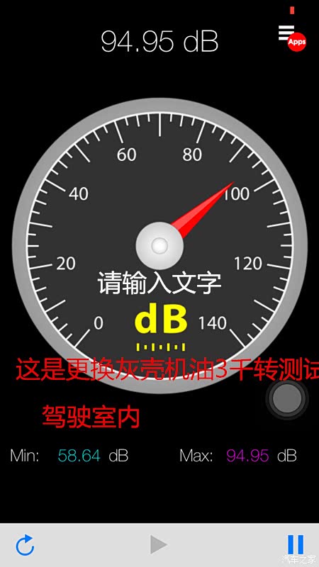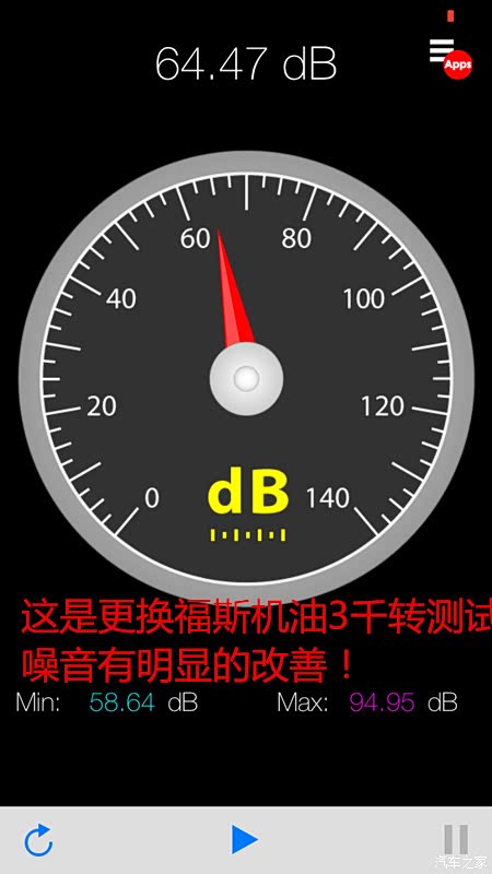 这张图是我们用的灰壳机油所采集的数据,平稳加速到持续保持3千转速,用分贝仪软件所测试的数据为85-94.95dB分贝,静止怠速数据为75dB分贝左右,这是一个驾驶室内的一个噪音数据!